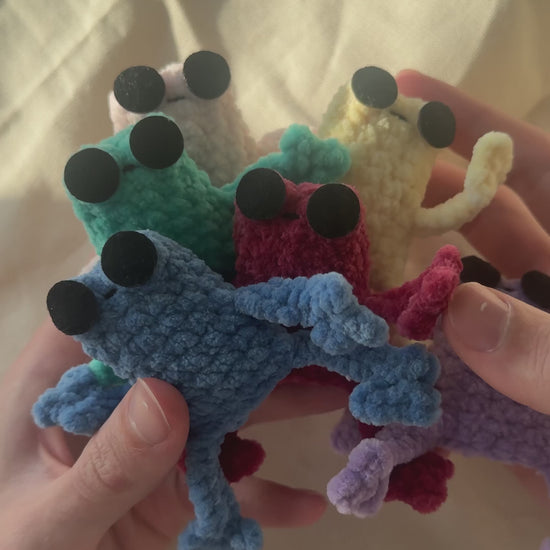 These are cute carefully crafted mini leggy frogs. Each leggy frog is handcrafted in Wicklow, Ireland by me, a 17 year old teen entrepreneur. Each plushie is made with high quality polyester yarn which is soft to touch. You can choose from 6 different colours, green, yellow, blue, pink, red and purple.